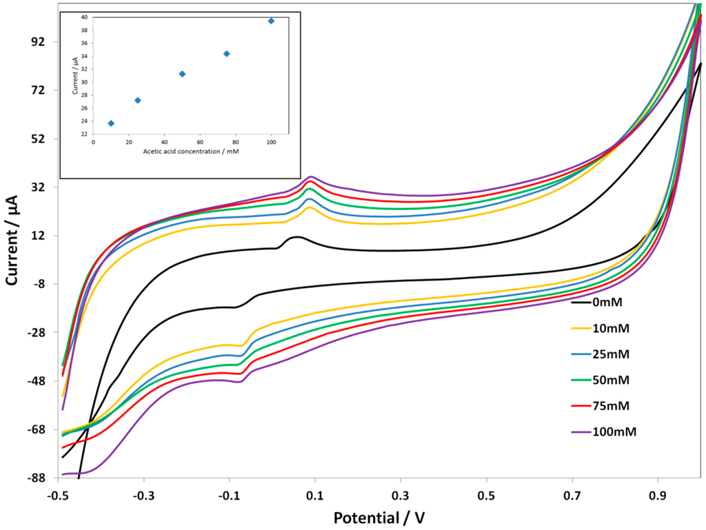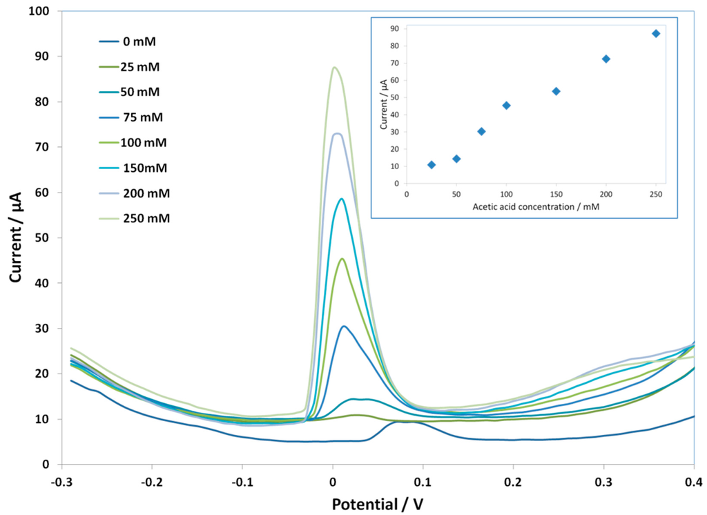 The sensor displays a linear response to acetic acid in the range of 10 mM–100 mM (inset in Figure 5) with a correlation coefficient R2 of 0.99. We obtained an LOD of 7.76 mM from the anodic peak at ca. +0.09 V. This result shows that the modified electrodes can be used in buffered, as well as in unbuffered media;aresult thatwill be useful for further development in bioreactors.