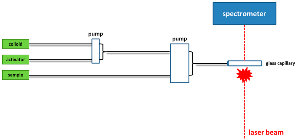 Other authors reported the use of a flow system to mix samples and colloidal substrates to optimize nanoparticles aggregation for SERS detection, with the aim of increasing repeatability [31,82,83]. In these approaches the metal colloids, the aggregating agents, and the sample are pumped in a flow system (constituted by a macroscopic flow cell [45] or a microfluidic system [77]), mixed at some point, and are then measured using a Raman microscope. A schematic diagram of the flow system used in this study is shown in Figure 1.