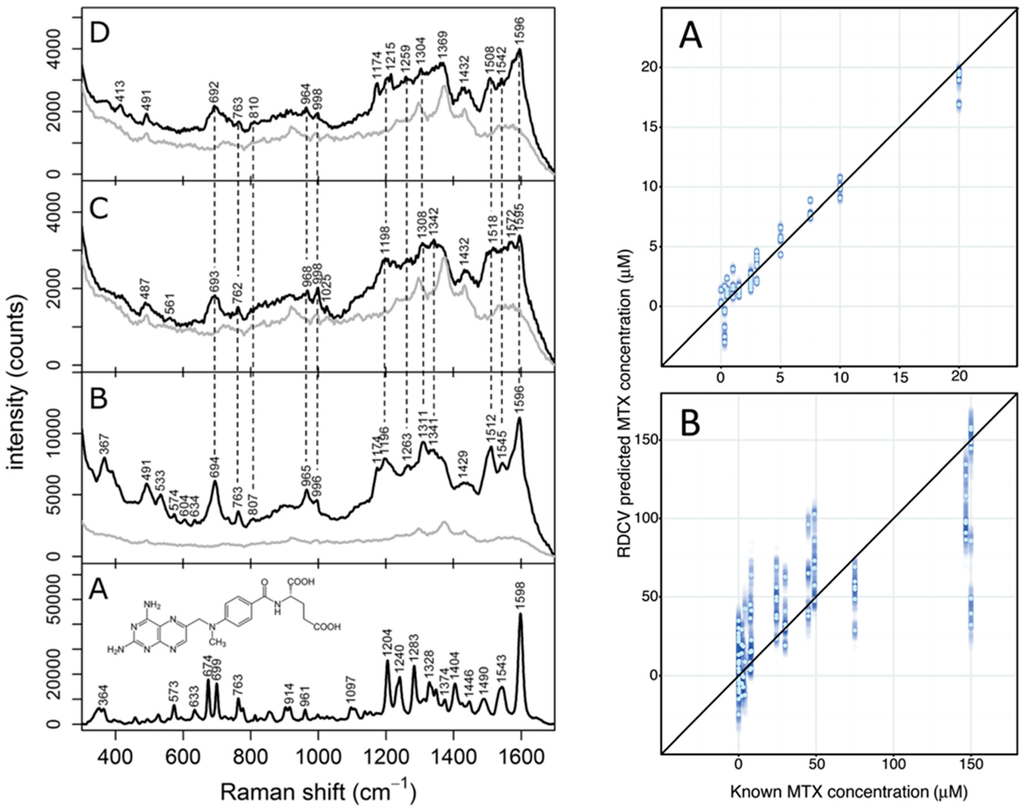 (Left) Raman of solid MTX (A) and SERS (B–D) spectra of MTX (10 µM) in PBS solution (B), PBS-HSA solution (C), and diluted human serum (D). Light gray lines represent the background SERS signal due to the substrate itself; (Right) diagnostic plots from repeated double cross-validation (RDCV) of SERS data collected from PBS-HSA solutions (A) and diluted human serum (B). Reprinted with permission from [54].