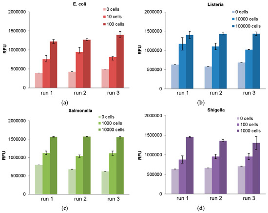 The sensitivity of our detection was demonstrated with three disc runs for a range of cell counts for all bacterial targets: (a) E. coli; (b) Listeria; (c) Salmonella; and (d) Shigella. These samples were run in assay buffer.