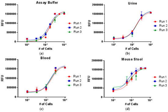 The ability to work with clinical samples without extensive sample preparation was demonstrated with the detection of E. coli in a variety of complex sample matrices: (a) buffer; (b) urine; (c) blood; and (d) mouse stool.