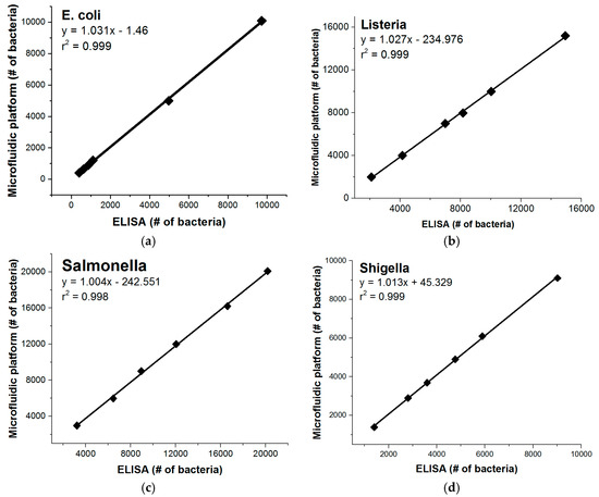 Method comparisons of the microfluidic platform to conventional ELISA detections were performed in assay buffer for (a) E. coli; (b) Listeria; (c) Salmonella; and (d) Shigella. The two methods are shown to correlate closely with neither method significantly under- or over-estimating the number of bacteria.