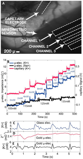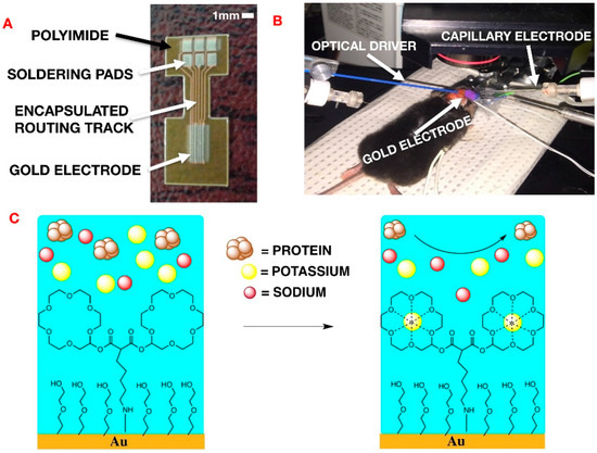 In terms of the particular application involved in this work, epileptic seizures are commonly studied in a mouse model. The performance of the potassium-sensitive probes was first validated in aqueous solutions containing different concentrations of cations (sodium, potassium and calcium). Additionally, to further test the potassium-sensitive probe, two independent in vivo mouse experiments were performed. Firstly, transient recording was undertaken optogenetically to evoke extracellular potassium rises in thy1:ChR2 mice (Figure 1B). The neurons of these genetically modified mice expressed a light-sensitive cation channel, which can be activated by blue light exposure. Secondly, transient [K+]o accumulation was also recorded after accompanying seizure-like events in C57 bl6 mice. These events were initiated by the application of 1.5 M of 4-aminopyridine solution onto the exposed cortical surface as described elsewhere. For comparison purposes, extracellular [K+]o was concurrently recorded with a glass capillary ion-sensitive recording electrode in all experiments [12,13].