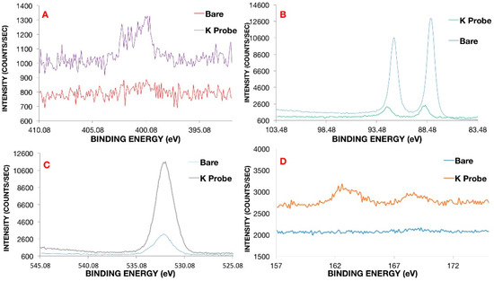 X-ray Photoelectron Spectroscopy (XPS) narrow scans on gold microelectrode for: (A) nitrogen; (B) gold; (C) oxygen and (D) sulfur, respectively. Bare cleaned gold was compared to gold coated with a mixed monolayer of K+ probe and MEG-SH in a 1:10 ratio.