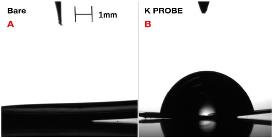 Confirmation of coating formation on the gold microelectrode was corroborated via X-ray photoelectron spectroscopy (XPS) (Figure 2) and contact angle-geometry (CAG) (Figure 3). CAG measurements showed consistency with previous results for MEG-SH deposited on gold [10]. As expected, bare gold displayed a higher value of contact angle due the presence of organic material on the surface (654°), while hydroxylated MEG-SH and K+ probe showed a significant decrease in angle due to the increased polarity associated with the hydroxyl terminated monolayer chain and oxygen rich crown ethers (145°) (Figure 3). XPS analysis was also used to verify confirmation of the K+ sensing coating on the gold microelectrode. Observation of the sulphur 2p signal (Figure 2D) was used to confirm the presence both monolayers, since sulphide bonds were used to attach MEG-SH and the K+ probe to the electrode surface. The increase in the percentage of nitrogen following K+ probe immobilization validated the attachment of the amine containing crown–ether probe via EDC/NHS chemistry (Figure 2A). Scans of the gold signal showed a significant decrease after coating with MEG-SH and the K+ probe, as expected in view of the fact that the electrode surface was covered with both carbon-based monolayers. Large increases in sulfur, carbon and oxygen amounts associated with the ether, sulfide and alkyl components of the ultrathin layer further served to demonstrate the existence of the thin film (Figure 2C,D. See also Supplementary Materials).