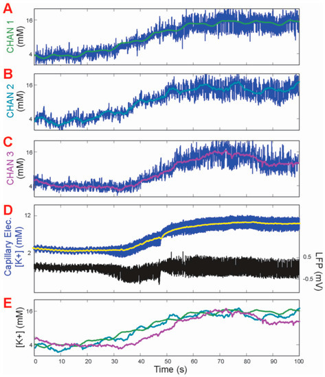 (A–C) At the onset of a 4-AP–induced focal neocortical seizure, [K+]o measurements were shown using the coated gold microelectrodes for three individual channels as per Figure 5A–C with smoothed signals overlying the raw signal; (D) [K+]o measurements for capillary electrode (left axis) and electroencephalogram signal from reference electrode (right axis); and (E) overlay of all three coated gold microelectrode channels with [K+]o smoothed measurements, showing a delayed response in channel 3 which was apparently farthest from the seizure-onset zone, here demonstrating spatio-temporal specificity. Due to the plateau of the signal at each electrode, only the first 100 s of the 5 min measurement are displayed.