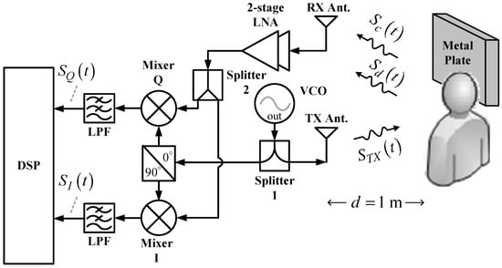 As shown in Figure 1, the conventional CW radar architecture comprises one transmit (TX) antenna and one receive (RX) antenna, both of which are panel antennas with an antenna gain of 12 dBi, one two-stage low-noise amplifier (LNA) with a power gain of 23 dB, one voltage-controlled oscillator (VCO), two power splitters, one quadrature mixer, two lowpass filters (LPFs), and one digital signal processor (DSP). The operating principle is as follows. The VCO generates continuous RF signals that are divided into two outputs by Splitter 1. One output of the signal passes through the quadrature power splitter, which further divides the signal into two output signals to pump the quadrature mixers. The other output signal, , from Splitter 1 is radiated by the TX antenna toward the chest of the subject one meter from the radar. Next to the subject, an additional 60 × 60 cm2 metal plate is installed for stronger signal reflection. Therefore, the RX antenna will receive two types of signals. One is the Doppler signal, , from the chest of the subject. Respiration and heartbeats cause the chest to rise and fall, which phase-modulates the emitted signal . The other is the clutter signal, , from other body parts of the subject and the metal plate. Stationary during the detection process, is an attenuated and time-delayed version of . After being received by the RX antenna, and go through a two-stage LNA and are then divided into two outputs by Splitter 2 for feeding the input ports of the quadrature mixer. After the lowpass filter (LPF) filters out the high-order intermodulation components from the output signals of the quadrature mixer, the in-phase signal and quadrature signal are output to the DSP with a built-in analog-to-digital converter (ADC) for subsequent signal processing and analysis from which the vital sign information of the subject can be obtained.