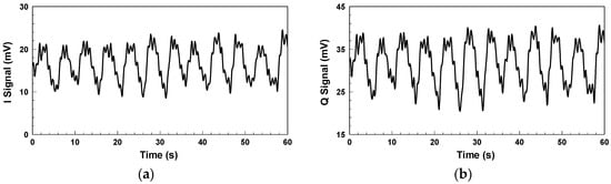 Baseband signals for non-contact vital sign detection using the conventional CW radar: (a) I signal; (b) Q signal.