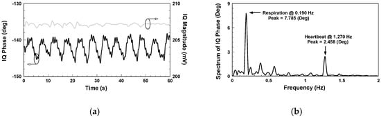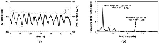 yields the demodulated phase and magnitude, represented by the black and grey lines, respectively, in Figure 5a, where the magnitude is around 181 mV. Performing fast Fourier transform on the IQ phase in Figure 5a gives the frequency spectrum shown in Figure 5b, where the respiratory and heart rates are, respectively, 11.7 and 75.6 beats per minute and the peak values 2.611 and 0.564 degrees, respectively.