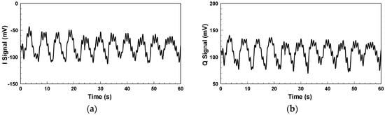 Figure 6 shows the IQ signals measured with the architecture in Figure 2. The additional DC offsets of the two signals are 65.345 mV and −36.113 mV, respectively. Although it has been proven that clutter signals have limited influence on the SIL radar [], hardware imperfections still cause additional DC offset. Compared with the conventional CW radar, however, the extent is significantly less. As shown in Figure 7a, the demodulated amplitude is around 207 mV. Figure 7b shows the IQ phase frequency spectrum, in which the peak values of respiration and heartbeat are 7.785 and 2.458 degrees, respectively, and the respiratory and heart rates are 11.4 and 76.2 beats per minute, respectively.