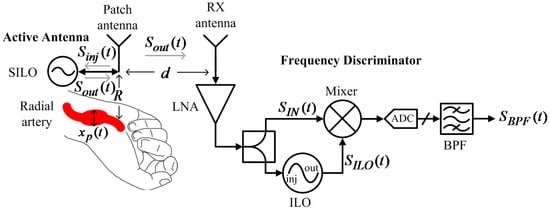 In addition to being used to illuminate the location of the radial artery and to detect the slight displacement of the skin surface, the SILO’s output signal, , can be wirelessly transferred to the frequency discriminator, at a distance of from the patch antenna, to be demodulated. As shown in Figure 8, is received by the RX antenna, LNA-amplified, divided into two outputs by the power splitter, and fed to the mixer and ILO. The input signal can be found as