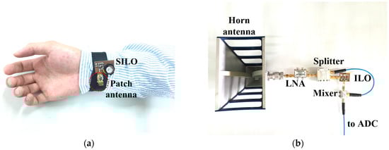 By comparison, both radars achieve similar IQ magnitude and phase results, but the SIL radar obviously consumes much less power because no LNAs are involved. The above experiment proves that the SIL radar offers better sensitivity and can reduce the number of active components to increase endurance. In addition, the SIL radar can be separated into two parts—SILO and frequency discriminator—for the detection of vital signs with a bistatic architecture [], which further reduces the size of the wearable device and therefore provides improved comfort.