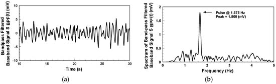 Pulse detection results for the subject wearing a short-sleeved shirt: (a) Bandpass-filtered baseband signal; (b) Spectrum of Figure 10a.