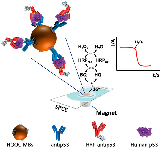 A simple electrochemical methodology for the determination of human p53 protein, based on the use of immune-MBs as selective capture microcarriers and amperometric detection on SPCEs, has been developed for the first time and applied to the analysis of cell lysates. Determination of p53 protein is carried out sandwiching it between specific capture antibodies covalently attached to previously-activated carboxylated MBs and HRP-labeled detector antibodies. The concentration of the target protein is related with the amperometric signal obtained (at −0.20 V vs. a Ag pseudoreference electrode) after magnetic capturing of the resulting modified MBs on the surface of a SPCE upon the addition of H2O2 and in the presence of HQ. The developed bioplatforms, with 7-day storage stability, allowed the selective and sensitive determination of the target protein (LOD of 1.2 ng·mL−1 for human p53 standards) without any signal amplification and successful applicability to the analysis of cell lysates. Moreover, the rapid, simple, portable, and cheap operation make this immunosensor a very attractive alternative to commonly-used ELISAs for the development of automated devices for on-site and routine determinations.