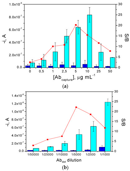 As examples, results obtained in the optimization of the AbC loading and the dilution applied to the commercial AbD solution, are provided in Figure 2a,b, respectively. As expected, while there are no significant differences between the B signals (obtained in the absence of target protein), the current measured at −0.20 V for 100 ng·mL−1 human p53 increased significantly with the AbC loading (Figure 2a) up to 50 µg/ mL, and then decreased drastically, most likely due to the steric hindrance of the antigen when large amounts of the capture antibody are immobilized [18]. Regarding the dilution applied to the AbD solution (Figure 2b), the currents measured both in the presence and in absence of p53 protein increased with the AbD concentration. This behavior was attributed to an increase in the non-specific adsorption of this antibody. A 1/5000 dilution factor, where the highest S/B ratio was observed, was chosen for further experiments.