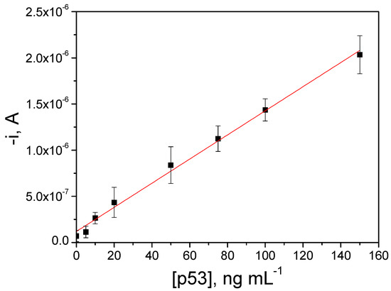 The calibration plot constructed for human p53 standards under the selected experimental conditions (Figure 3) exhibited a linear range (r = 0.998) between the measured current and the p53 concentration from 5–150 ng·mL−1, with a slope value of (1.3 ± 0.1) × 10−8 A·mL·ng−1 and an intercept of (1.4 ± 0.8) × 10−7 A. It is important to mention that, despite using a one-step sandwich immunoassay, no induction of any hook effect was observed at the tested concentration levels. This effect would only be expected for much larger concentrations than those usually considered as cut-off values in clinical samples for p53 overexpression in cancer ailments, thus ensuring the absence of potential misdiagnosis due to falsely decreased results. Detection (LOD) and quantification (LQ) limits, estimated according to the 3 × sb/m and 10 × sb/m criteria, respectively, where m is the slope of the linear calibration plot, and sb is the standard deviation of 10 amperometric signals measured in the absence of the target, were 1.29 and 4.31 ng·mL−1, respectively.