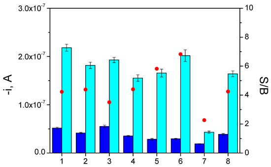 Immunosensor selectivity towards p53 protein. Current values measured for 0.0 (dark blue bars) and 10.0 (light blue bars) ng·mL−1 human p53 standard in the absence (1) and in the presence of: 10.0 ng·mL−1 TNFα (2); 5.0 ng·mL−1 ErbB2 (3); 5.0 ng·mL−1 ERα (4); 5.0 ng·mL−1 PR (5); 5.0 mg·mL−1 BSA (6); 1.0 mg·mL−1 human IgG (7) and 0.1 mg·mL−1 human IgG (8). Supporting electrolyte, 0.05 M sodium phosphate solution, pH 6.0; Eapp = −0.20 V vs. the Ag pseudo-reference electrode. Other conditions are as described in Table 1 (selected values column). S/B ratio (red •) are those obtained for each experimental point. Error bars estimated as triple that of the standard deviation (n = 3).