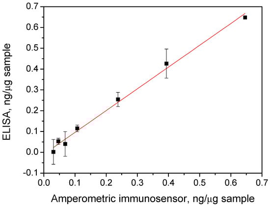 The obtained results were compared with those provided by a commercial ELISA kit. A paired samples t-test demonstrated that no significant differences (α = 0.05) existed between the results found by both methods (p-value = 0.50). It is important to note the reliability of the approach just after a simple dilution with blocker casein solution despite the complexity of samples. The plot of the mean contents obtained with the ELISA kit versus those provided by the magnetoimmunosensor (Figure 5) resulted in a linear least-squares regression graph (r = 0.997) with a slope value of (1.04 ± 0.04) and an intercept of (−0.01 ± 0.01). As can be observed, the correlation found was highly satisfactory since the confidence intervals (at a significance level of α = 0.05) for the slope and intercept included the unit and the zero values, respectively, indicating that the methodology involving the use of the magnetoimmunosensor exhibited no systematic errors and can be successfully used for the reliable determination of p53 protein in cell lysates.