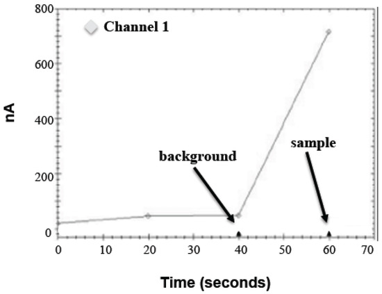 Amperogram (screenshot) of a typical PHAD (Portable Hazardous Agent Detector) instrument run. All the data presented here was obtained while the PHAD instrument was in single-channel mode, i.e., Channel 1 in the sample above.