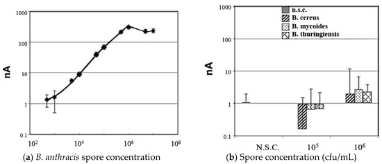 Immunomagnetic separation (IMS) is a technique in which antibodies specific to a target organism are immobilized on magnetic beads to enable fast and efficient concentration and purification of the target from crude samples, thus reducing or eliminating any matrix effects from contaminants in subsequent testing. IMS has been used previously in combination with other techniques for the detection of Bacillus anthracis spores in various matrices [8,9,10,11,12]. The large surface area available on magnetic beads for the immobilization of antibodies allows for an efficient and sensitive capture of spores, although the binding specificity and limit of detection generally depend on the antibodies and binding conditions used. In this study, IMS is combined with amperometry, which offers the advantages of being very sensitive, robust, and economical and can be made compact and easy to use in the field [13].