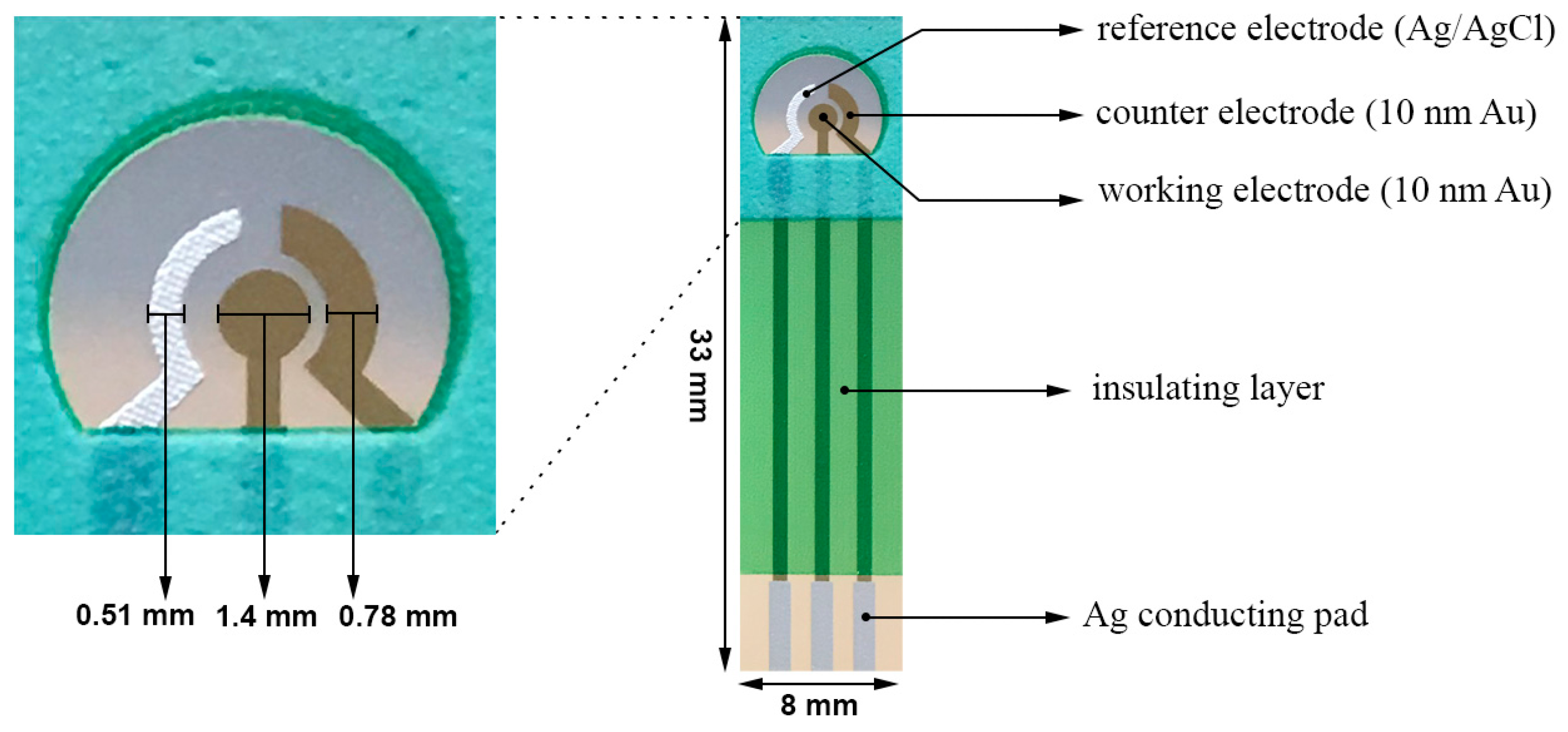 This biosensor prototype for the detection of T-Tau was based on a platform biosensor design. It has a three-electrode configuration. Both the working and counter electrodes were thin gold films 10 nm in thickness. The gold film was deposited by sputtering physical vapor deposition at an atomic level. No binder was employed in any thick-film-printed biosensor including commercially available three-electrode based biosensors. Therefore, the surface of the gold film working electrode was uniform and reproducible. The reference electrode was a thick-film-printed Ag/AgCl electrode. The whole biosensor was formed on a polyethylene terephalate (PET) substrate. Laser ablation technique was used to define the size and dimensions of the biosensor and its electrode elements. The insulator was a thick-film-printed silicon-free dielectric layer made of Nazdar APL 34 ink (Shawnee, KS, USA). This was a cost-effective roll-to-roll fabrication process. In this study, 100 individual biosensors in 4 rows were produced on each PET substrate (355 × 280 mm2). Figure 1 shows the structure and actual dimensions of this biosensor. The overall dimensions of an individual biosensor were 33.0 × 8.0 mm2. The working electrode area was 1.54 mm2 accommodating 20–25 µL of liquid test sample required in this study. A more detailed description of the design and fabrication process of this biosensor has been presented elsewhere [18].