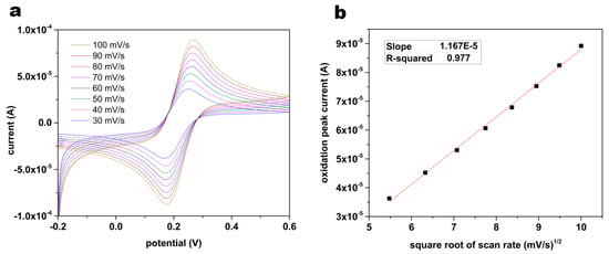 Responses of biosensors were characterized by assessing the stability and reproducibility of the electrochemical surface area. Cyclic voltammograms were obtained at scan rates ranging from 30 to 100 mV/s in a solution of K3Fe(CN)6 and K4Fe(CN)6, 5 mM in each component, having 0.1 M KCl (Figure 2a). As presented in Figure 2b, oxidation peak current presented a linear relationship versus the square root of the scan rate. Assuming the diffusion coefficient of ferricyanide ion to be constant, this linear relationship demonstrated the stability of electro-active surface area based on the Randles–Sevcik equation. Using the equation, the calculated electro-active surface area showed less than 2% relative standard deviation from sensor to sensor (n = 3), signifying high reproducibility.