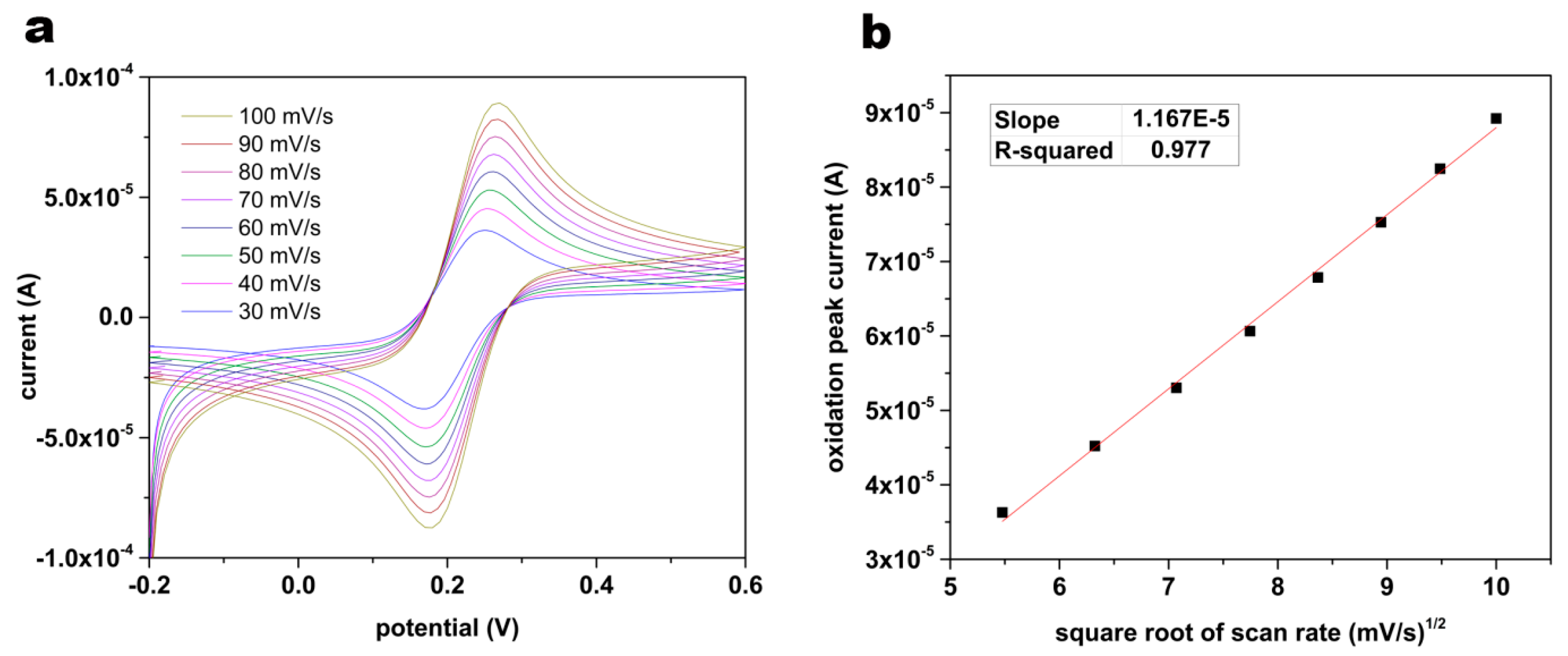 (a) Cyclic voltammograms obtained in a solution of K3Fe(CN)6 and K4Fe(CN)6, 5 mM in each component, having 0.1 M KCl at scan rates ranging from 30 to 100 mV/s and (b) oxidation peak current plotted versus square root of scan rate.