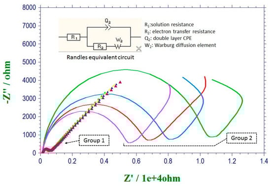 In order to validate the enhancement of the sensor response, reproducibility, and electron charge transfer due to the cleaning procedure, electrochemical impedance spectroscopy (EIS) was employed for two groups of sensors consisting of four sensors each. Sensors in Group 1 were subjected to the cleaning protocol described above, whereas sensors in Group 2 were cleaned by ethanol and deionized water (DIW) sequentially. A solution of K3Fe(CN)6 and K4Fe(CN)6, 5 mM of each component, was prepared in 0.1 M PBS and used for EIS tests. Twenty microliters of redox couple solution was casted on the sensing area of each sensor for EIS. Figure 3 presents the EIS results obtained for the two groups of sensors in the form of a Nyquist plot using a frequency range of 10−2 to 104 Hz with 5 mV voltage amplitude. An equivalent electrical circuit model was fitted to EIS data using EC-lab software. Randles equivalent circuit was selected to model the experimental data. In a typical EIS measurement, the initial potential was set at 0.0 V. The high frequency was set at 10,000 Hz and the low frequency was set at 0.01 Hz. The amplitude was set at 0.005 V and the quiet time was set at 2 s.
