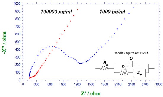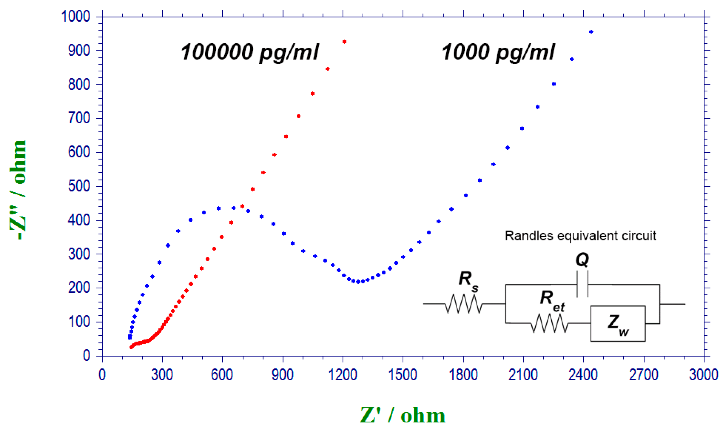 In order to explain the detection mechanism of the T-Tau biosensor, EIS measurements were carried out for biosensors incubated in solutions with different concentrations of T-Tau protein. Figure 4 presents the EIS Nyquist plots obtained in presence of K3Fe(CN)6/K4Fe(CN)6 redox couple for antibody immobilized biosensors incubated in T-Tau solutions of 1000 and 100,000 pg/mL. Antigen solutions were prepared in 0.1 M PBS. A Randles equivalent circuit was fitted to the experimental data using EC-lab software. The data obtained from the circuit fitting is presented in Table 2. Ret value in Randles equivalent circuit is defined as the resistance to charge transfer of the electrochemical interface.