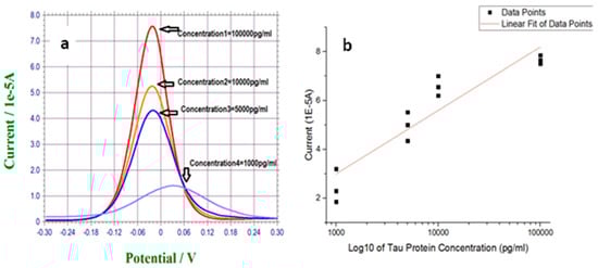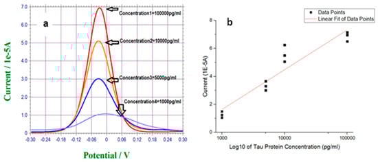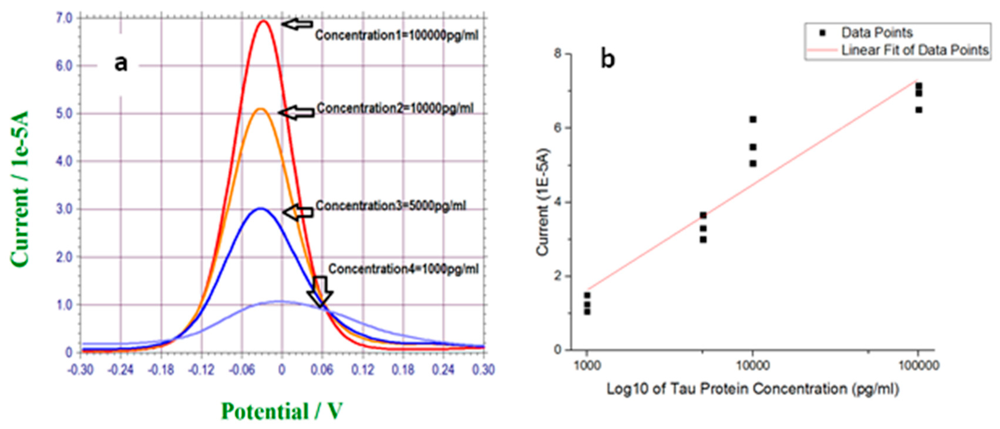 Figure 6a shows the typical DPV measurements of various T-Tau protein concentrations in the serum. The T-Tau protein concentration was tested between 1000 pg/mL and 100,000 pg/mL. Similar to the test in 0.1 M PBS, a single-use, disposable biosensor was used for each measurement. Figure 6b shows the corresponding calibration curve of DPV measurements in serum based on results shown in Figure 6a with n = 3. The anti-T-Tau concentration used in this phase of study was 500,000 pg/mL. Figure 6b yields a least-square fitted calibration equation of Y = 2.8X − 6.9, where Y is the current outputs of the biosensor and X is the T-Tau concentration in blood serum. The R2 value of this equation was 0.88. It is feasible to optimize operational parameters further in this T-Tau detection system, such as the antibody concentration, the range of the detecting T-Tau proteins, concentration, and others. Our purpose of this presentation is to demonstrate that the basic designed biosensor with DPV transduction mechanism can be effectively used for T-Tau protein detection.