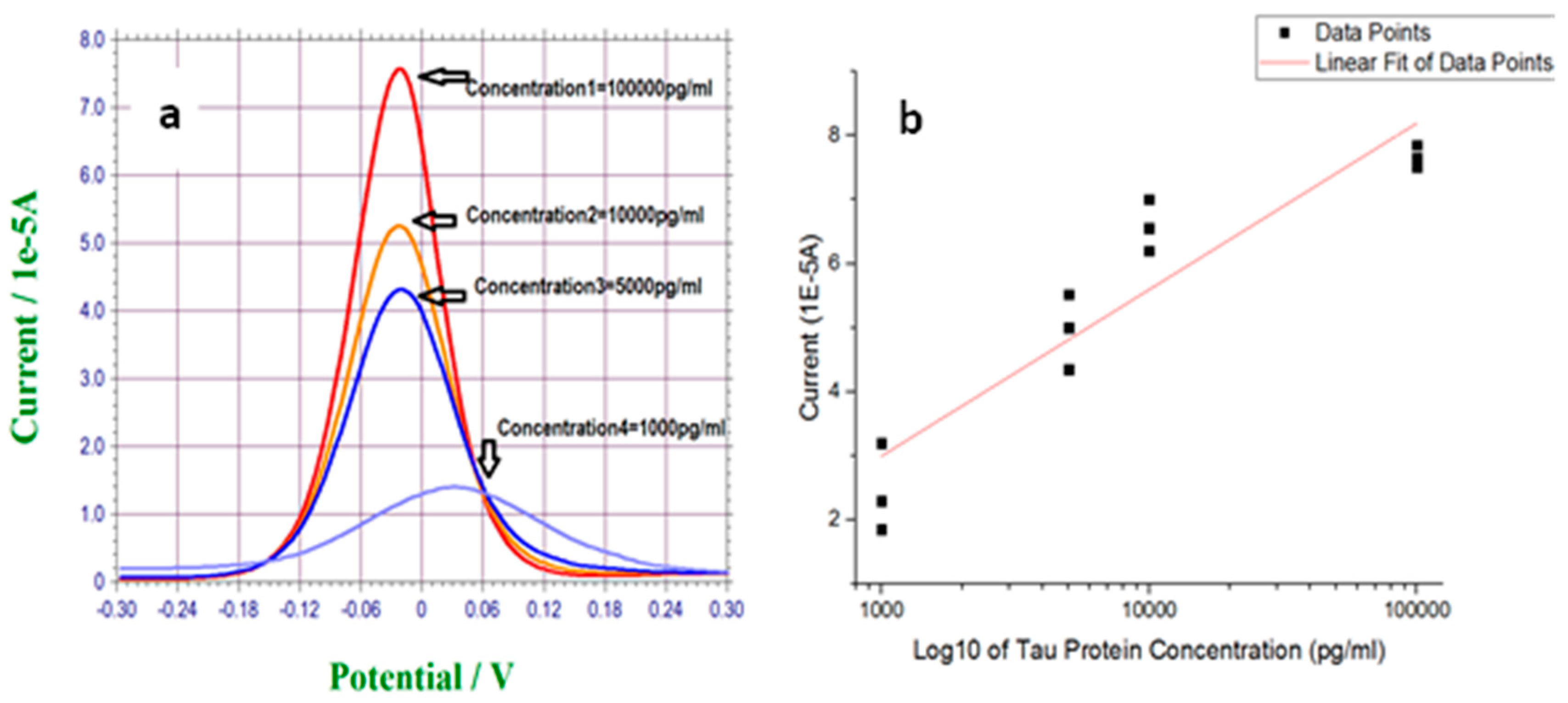 (a) DPV measurement of T-Tau proteins over the concentration range of 1000 pg/mL to 100,000 pg/mL in undiluted human serum. (b) Calibration curve obtained from DPV measurements for T-Tau protein concentration range of 1000 to 100,000 pg/mL in undiluted human serum. Anti-T-Tau concentration is 500,000 pg/mL.