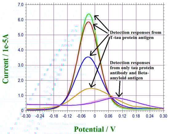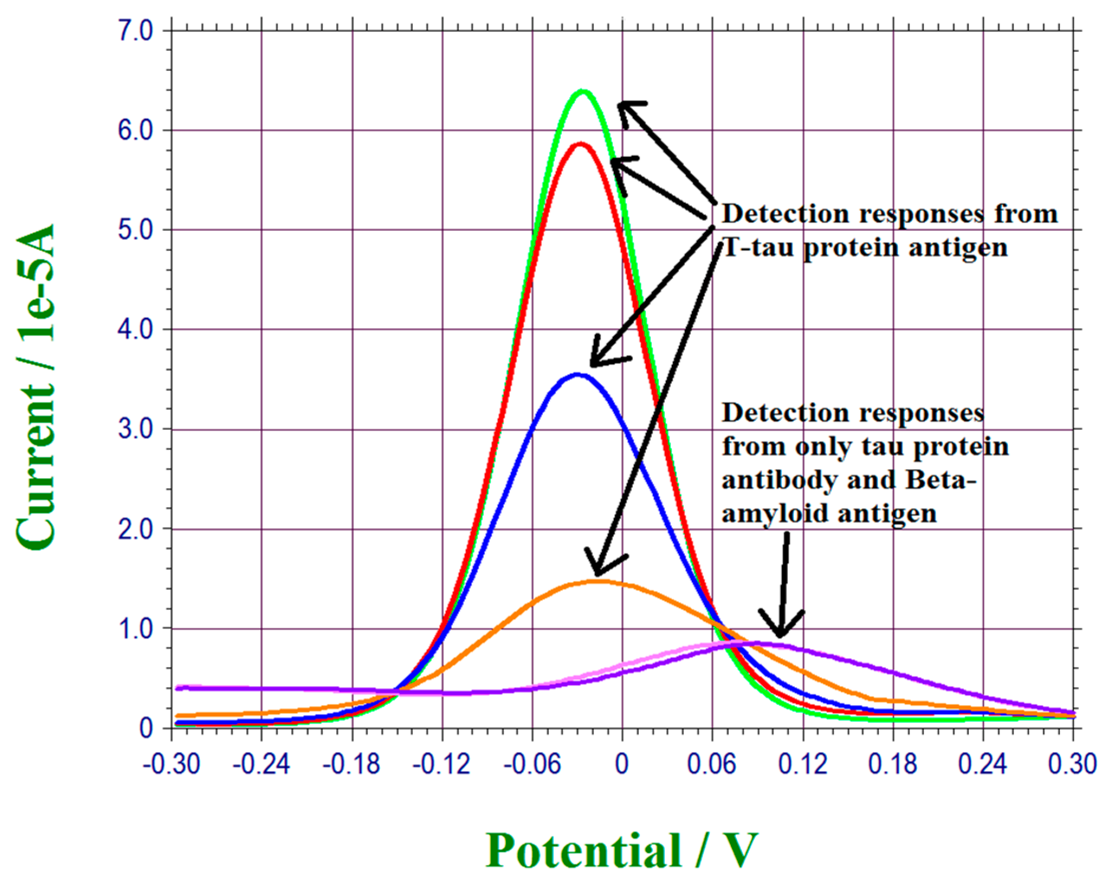 The Tau protein ladder, human recombinant (Cat. No. T7951, Sigma Aldrich, St. Louis, MO, USA) was used in this study. Adult brain Tau proteins are varied in size from 352 to 441 amino acids (approximately 36.8 to 45.9 kDa). This protein ladder contained 6 recombinant Tau proteins with molecular masses of 36.8, 39.7, 40.0, 42.6, 42.9, and 45.9 kDa, respectively [30,31]. In the purchased T-Tau protein ladder, 50 µL contained 0.25 µg of each of the six isoforms. In this study, we did not intend to measure each isoform separately and only assessed that the parameter was the total T-Tau protein in the test medium. We used 0.1 M PBS as test medium (pH = 7.4), and dissolved the T-Tau protein ladder in PBS over the range of 1000 pg/mL to 100,000 pg/mL. The anti-T-Tau concentration used was 500,000 pg/mL. This higher antibody concentration was used in order to minimize the possibility of its becoming a rate-limited component in this bio-recognition mechanism. It was feasible to modify and optimize this antibody concentration. This future investigation is beyond the scope of this presentation.