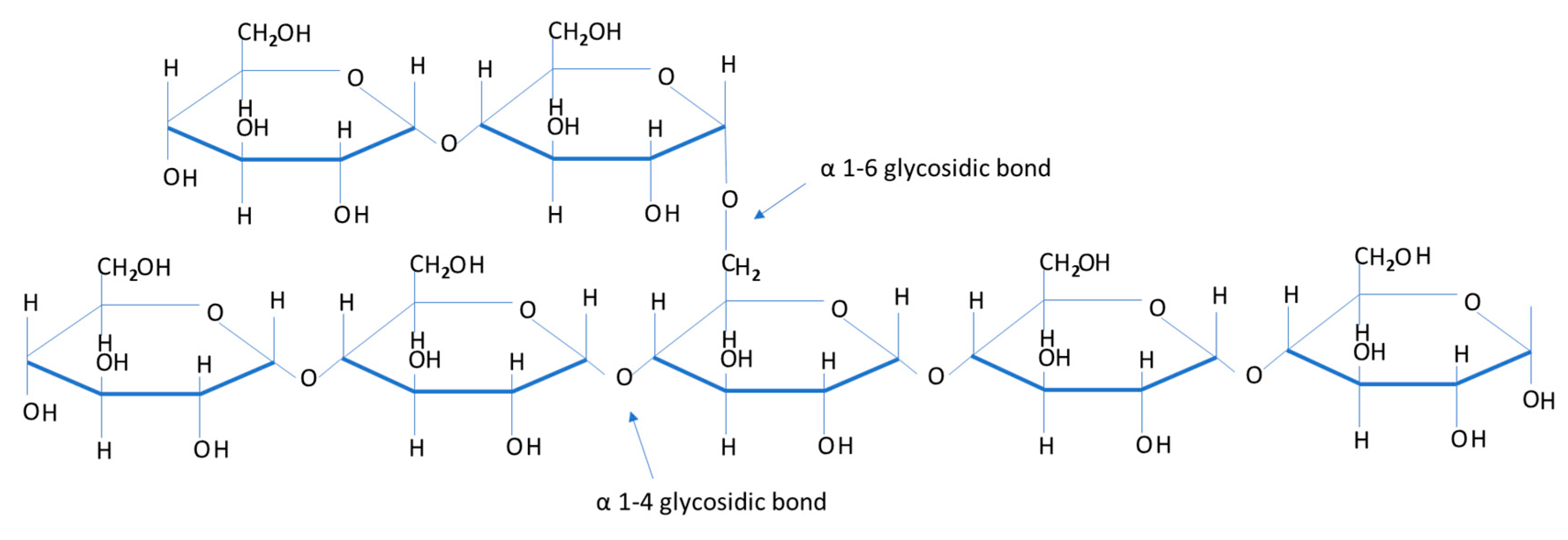 A section of a glycogen molecule illustrating individual glucosyl units. It shows the two different types of glycosidic bonds used to make up glycogen.