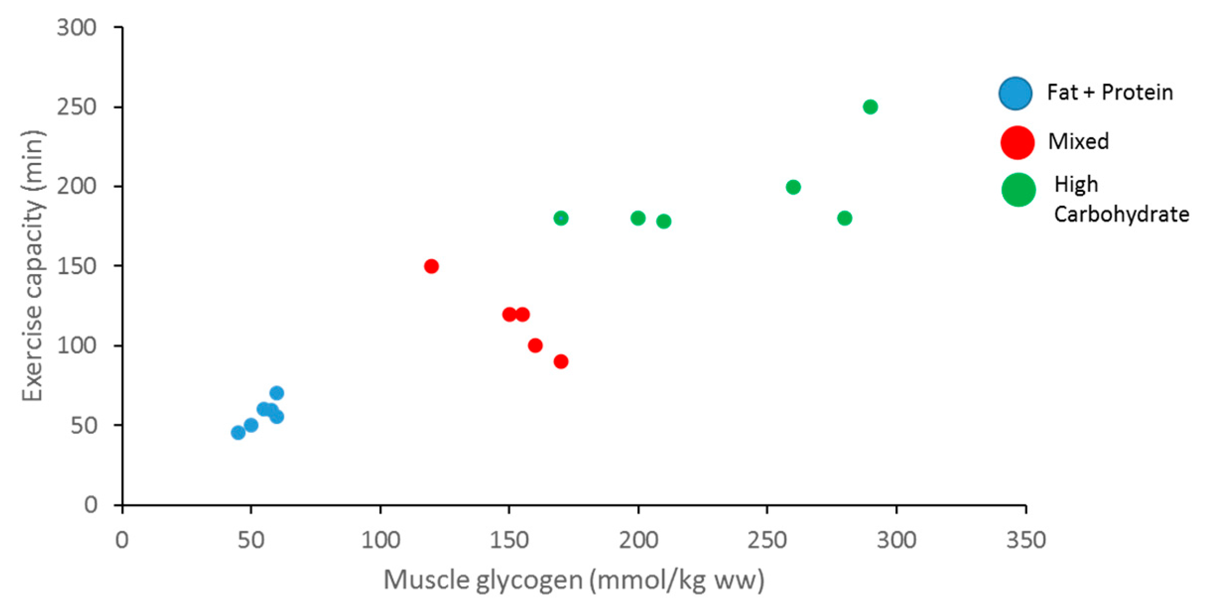 Relationship between muscle glycogen content, exercise capacity, and diet (adapted from Bergstrom et al., 1967).