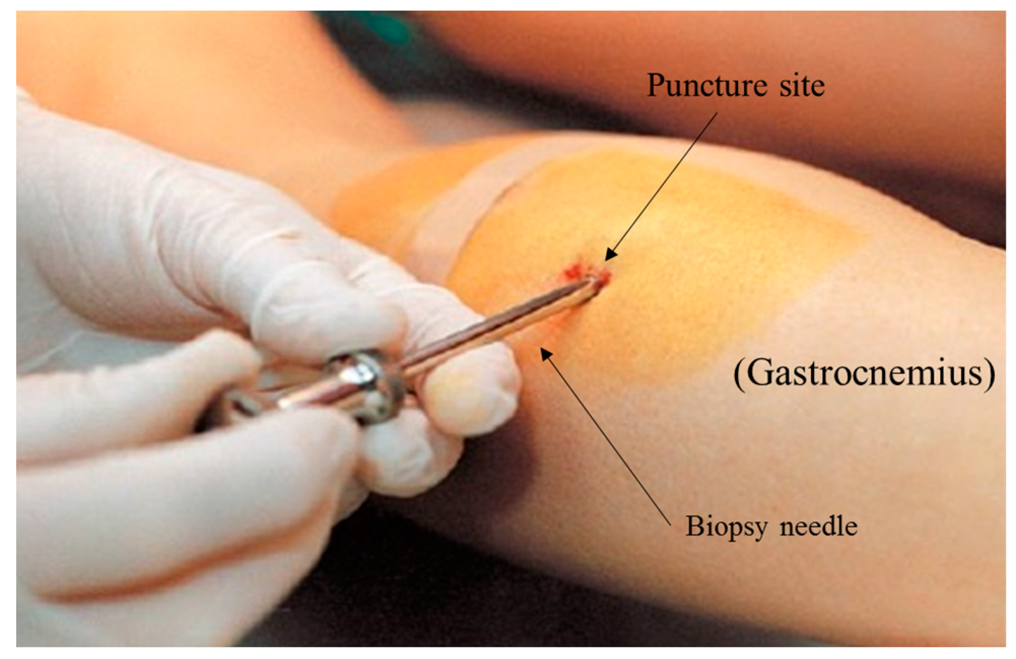 - Tarnopolsky, M.A.; Pearce, E.; Smith, K.; Lach, B. Suction-modified bergström muscle biopsy technique: Experience with 13,500 procedures. Muscle Nerve 2011, 43, 716–725. [Google Scholar] [CrossRef] [PubMed]