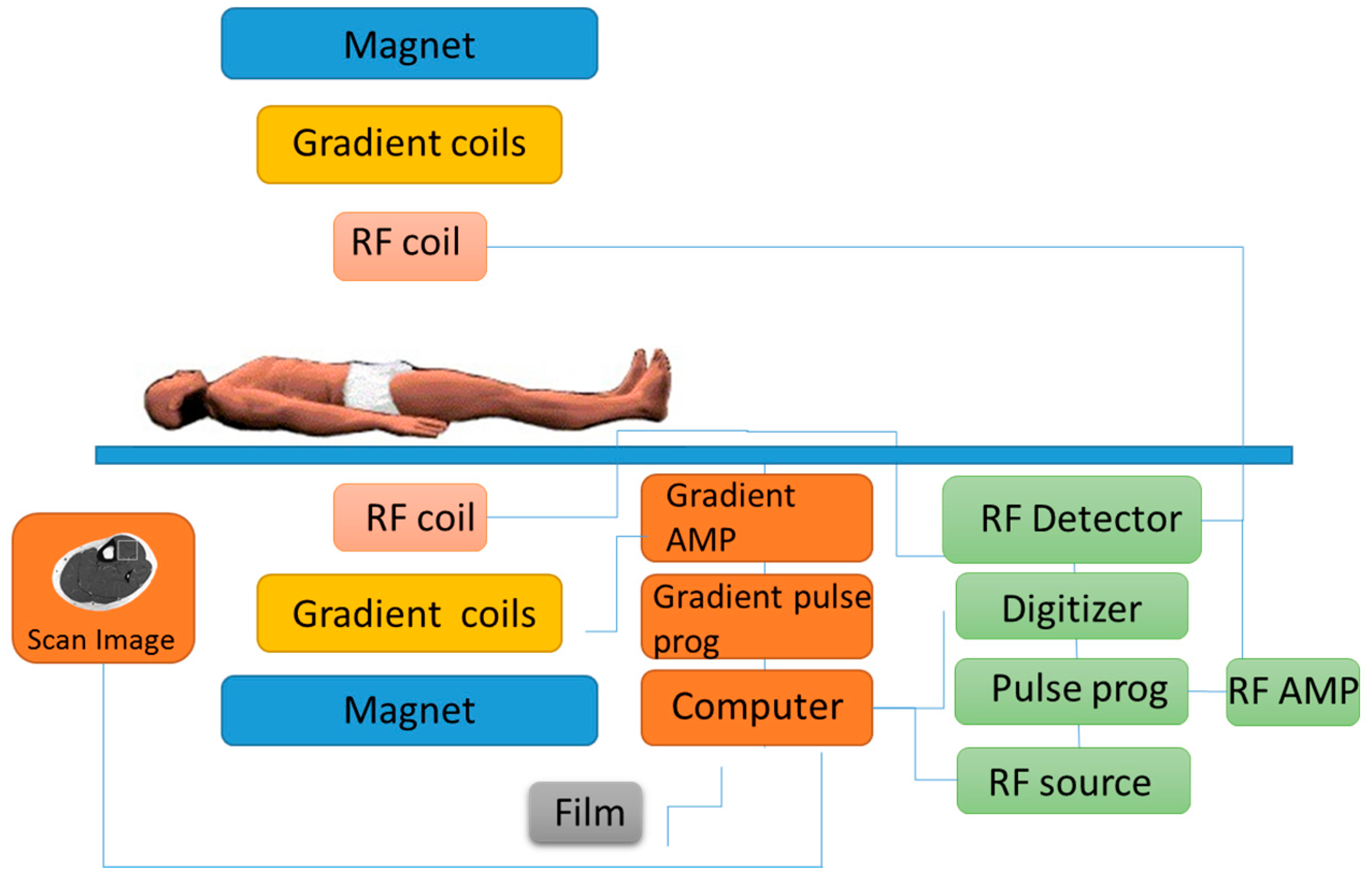 Magnetic resonance spectroscopy (MRS) is usually done alongside the more commonly used magnetic resonance imaging (MRI) scan. MRS measures the chemical content of MR-visible nuclei, which include the metabolically elements of hydrogen (1H), carbon (13C), and phosphorus (31P) [43]. Whereas MRI establishes the spatial distribution of water (and lipid) protons within the site of interest [43]. MRS is performed using the same machine as conventional MRI scanner, using a powerful magnet, radio waves, and a computer to create detailed images (Figure 7). Spectroscopy is a series of tests that are added to the MRI scan across specific regions of the body for chemical metabolism. There are no known health risks associated with the magnetic field or the radio waves used in either MRI or MRS and all contrast agents used are all deemed safe and are FDA-approved.