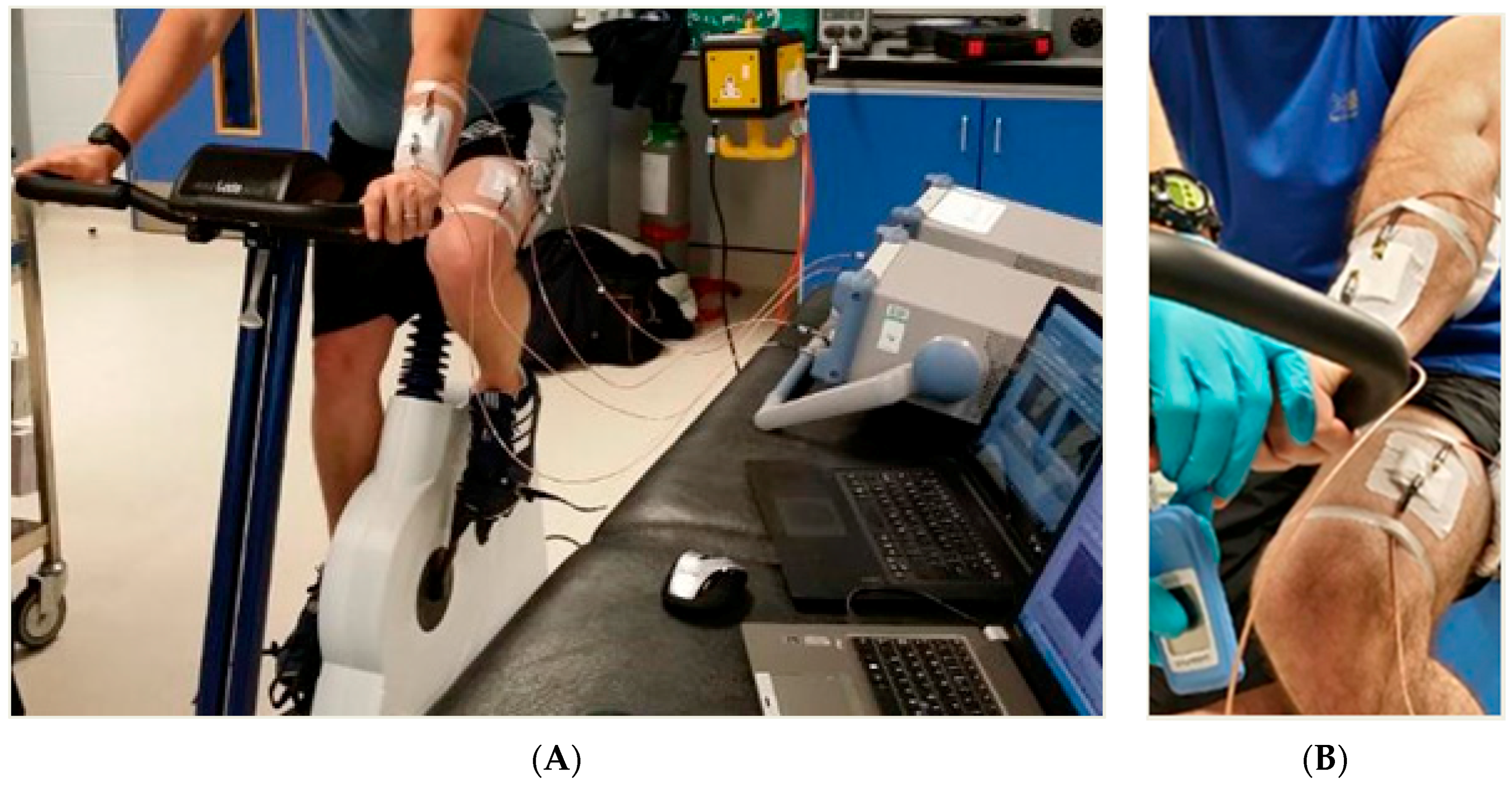 (A) Experimental setup, showing participant on ergometer with sensors attached; and appropriate data acquisition hardware: (B) illustrates placement of sensors both arm and leg during a blood lactate exercise protocol.