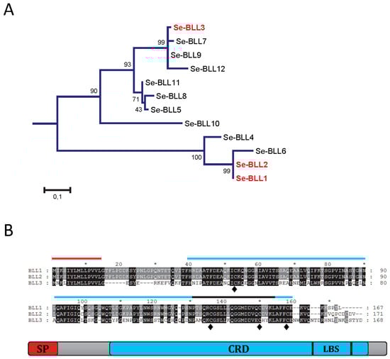 Amino acidic sequences of the bracovirus-like lectins (BLL). (A) Phylogenetic relationship of the different BLLs detected in the transcriptome of Spodoptera exigua. Phylogenetic distance was calculated by the Maximum-likelihood method. Reliability of an inferred tree was determined using the bootstrap test (1000 replicates). For a clearer view of the branches, bootstrap values are reported over 100; (B) Amino acidic alignment of the three BLLs studied, indicating the presence of the predicted signal peptide (SP), the carbohydrate recognition domain (CRD), the ligand binding surface (LBS), and the conserved cysteine residues (♦).