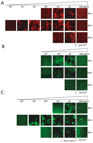 Bacterial agglutination in the presence of the BLLs. Representative images of the agglutination of three types of bacteria ((A) E. coli dt-tomato; (B) B. thuringiensis GFP; (C) P. aeruginosa) in the presence of serial dilutions of the three BLLs. Controls of agglutination in the absence of Ca2+ (w/o Ca2+) are also shown.