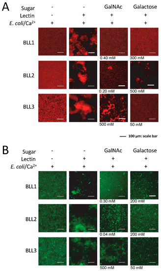 For the agglutination assay, BLL1, BLL2, and BLL3 were serially diluted (1/10 factor) in Tris buffer and 45 µL aliquots of each lectin were mixed with 45 µL of the bacteria suspension. After incubation for 1 h at room temperature in the presence or the absence of 10 mM CaCl2, samples were observed and photographed under a fluorescent microscope (DMI3000, Leica Microsystems, Wetzlar, Germany).