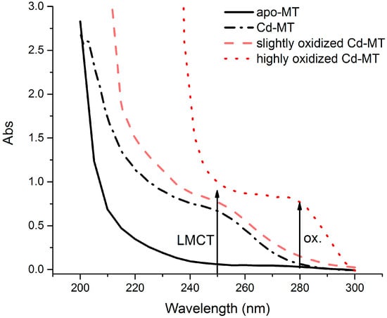 Far UV absorption spectra of metallothionein (MT) used to monitor oxidation of thiols. Apo-MT (solid black line), Cd-MT (dashed black line) are both fully reduced with no thiol oxidation. Aerated MT solutions are shown to illustrate the oxidation: minimal oxidation (dashed pink line) and significant oxidation (dotted red line). The ligand-to-metal charge transfer (LMCT) band and the oxidized thiol absorbance are highlighted with arrows.