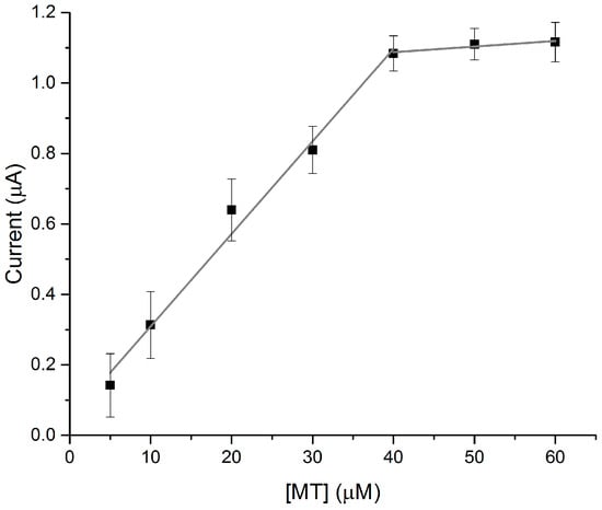 Influence of paper disc MT-loading on the peak heights of the SCys responses at +0.22 V in the electrochemical scans. The MT concentrations of each of the 20 μL aliquots added to the paper discs are plotted on the x-axis (n = 3).