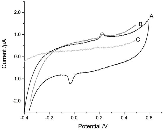 The blank discs on the SPCEs did not show any signals in the scans performed (Figure 3). The MT-adsorbed discs gave signals slightly above +200 mV in both ASV and CV scans, likely due to the presence of free thiols in the protein. There was also a reduction peak around −50 mV in the CV scan which corresponds to the cysteinyl thiols in MT. The heights of the peaks are relatively small and this is due to the presence of Zn/Cd in the isolated, lyophilized protein masking the thiol signal. The presence of these bound metals is essential to the stability of the protein for longer periods of storage, as apo-MT degrades more rapidly and is prone to oxidation [38]. Compared to apo-MT, Cd/Zn-MT can be stored as a frozen solution or lyophilized and reconstituted after many years of storage without significant degradation.