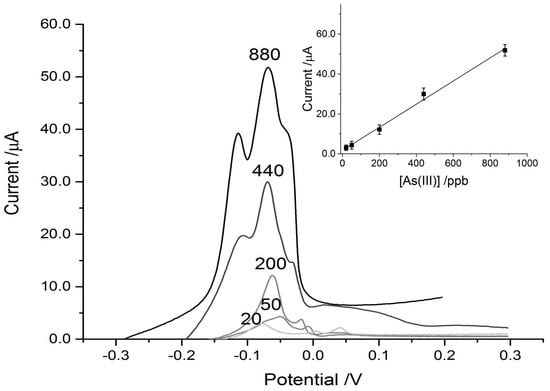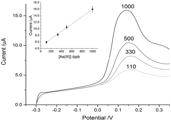 In addition to an increase in signal intensity, the interactions between the arsenic and MT-disc shifted the peak intensity to a more negative potential. The control disc with no MT adsorbed showed As3+-dependent peaks at approximately +160 mV (Figure 4) which is very similar to that reported in the literature with more sensitive electrodes [40,41,42]. The potential of As3+-stripping in the MT-modified disc scans was shifted to approximately −60 mV and this type of shift is consistent with coordination by thiol [43] and protein modified electrodes [44]. Both the control and experimental traces had high degrees of linearity over the range tested (Table 1).