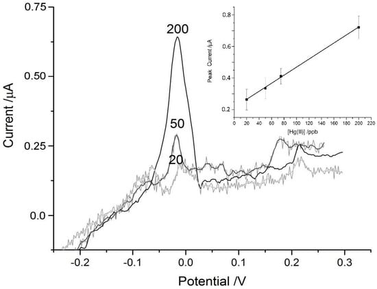 Representative ASV scans for MT-loaded discs with 25 μL drops of diluted Hg2+ standards with concentrations of 20, 50 and 200 ppb. The concentration is indicated on the graph near the Hg2+ peaks around −0.02 V. The peaks near +0.2 V correspond to the thiols of metallothionein. Inset in the top right corner is the linear fit of the data (n = 3).
