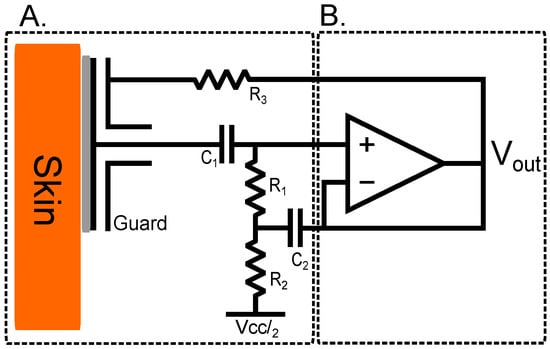 Schematic of the high impedance design configuration showing bootstrapped front end (A); and voltage follower (B).