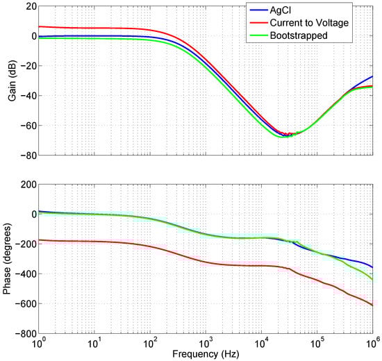 Proven in experimental results, Figure 5 shows that the frequency and phase response of the AgCl electrodes plotted against the bootstrapped electrode are very nearly identical. Less than 0.3 dB gain separates the AgCl and Bootstrapped electrode, this is attributable to the depth of the insulator between the electrode and the skin, which lowers the coupling strength. The difference between the Bootstrapped and the current-to-voltage electrode results for the phase are 180°. This is expected due to the inverting configuration of the amplifier i.e., Equation (1) where the output is equal to the negative of the input current multiplied by the feedback resistance.