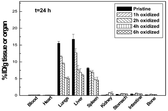 According to Jain et al., the density of functionalization is one of the key factors that impacts the CNTs’ toxicity [26]. In their study, they focused on acid-oxidized multi-walled CNTs, exploring how the degree of functionalization changes the nanotubes’ toxicity and biodistribution. As detailed in Figure 2, they observed that the toxicity of CNTs with acid-oxidized functionalization distinctively decreases if compared with the one of pristine nanotubes, suggesting that a higher toxicity is related to a lower functionalization density. Moreover, they demonstrated that the biodistribution of CNTs in organs such as liver, spleen and lungs is affected by the functionalization density.