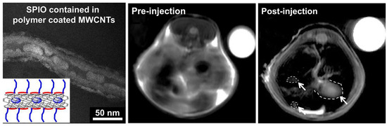 Magnetic Resonance Imaging (MRI) is currently one of the most powerful diagnosis tools in medical science [74]. MRI not uses ionizing radiation, but a high-intensity magnetic field to align the nuclear magnetization of hydrogen atoms in water within the body, taking advantage of the difference in water concentration among tissues to produce high-quality anatomical images with high spatial resolution [75]. MRI contrast agents are classified into two classes: spin-lattice relaxation agents, with larger effects on T1 shortening and spin-spin relaxation agents with larger effects on T2 shortening, where T1 and T2 are the proton relaxation times. In order to produce an MRI-active CNT CA, a paramagnetic or superparamagnetic agent must be conjugated to or encapsulated within the CNT platform [76,77]; moreover, a proper agent is needed to target tumors [78,79,80]. Recently, Liu et al. placed, inside the inner cavity of MWCN SuperParamagnetic Iron Oxide (SPIO), nanoparticles to create a T2-weighted contrast agent. To inhibit aggregation and improve their vascular biocompatibility, the SPIO-MWCNT were covered with a polymer (Figure 7, left). Diblock copolymers (PMETAC-b-PEGMA) were prepared by RAFT polymerization following the procedure described in [81]. The final polymer was composed of two units with very specific duties: the cationic PMETAC block was designed to electrostatically bind to the negatively-charged oxidized CNTs, while the second functional PEGMA block was designed to improve the aqueous dispersion stability of the hybrid material.