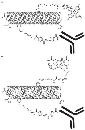 Graphical representations of the key moieties that were appended to the water-soluble SWCNT-NH2 by covalent-functionalization with radionuclides, 1,4,7,10-tetraazacyclododecane- 1,4,7,10-tetraacetic acid (DOTA), desferrioxamine B (DFO) and antibodies (note, not drawn to scale). (A) Radioimmunotherapeutic drug Construct I (SWCNT-([225Ac]DOTA)(E4G10)); (B) radioimmunoimaging drug Construct II SWCNT-([89Zr]DFO)(E4G10). Reproduced from [94]. Copyright 2010 Dove Medical Press Ltd.